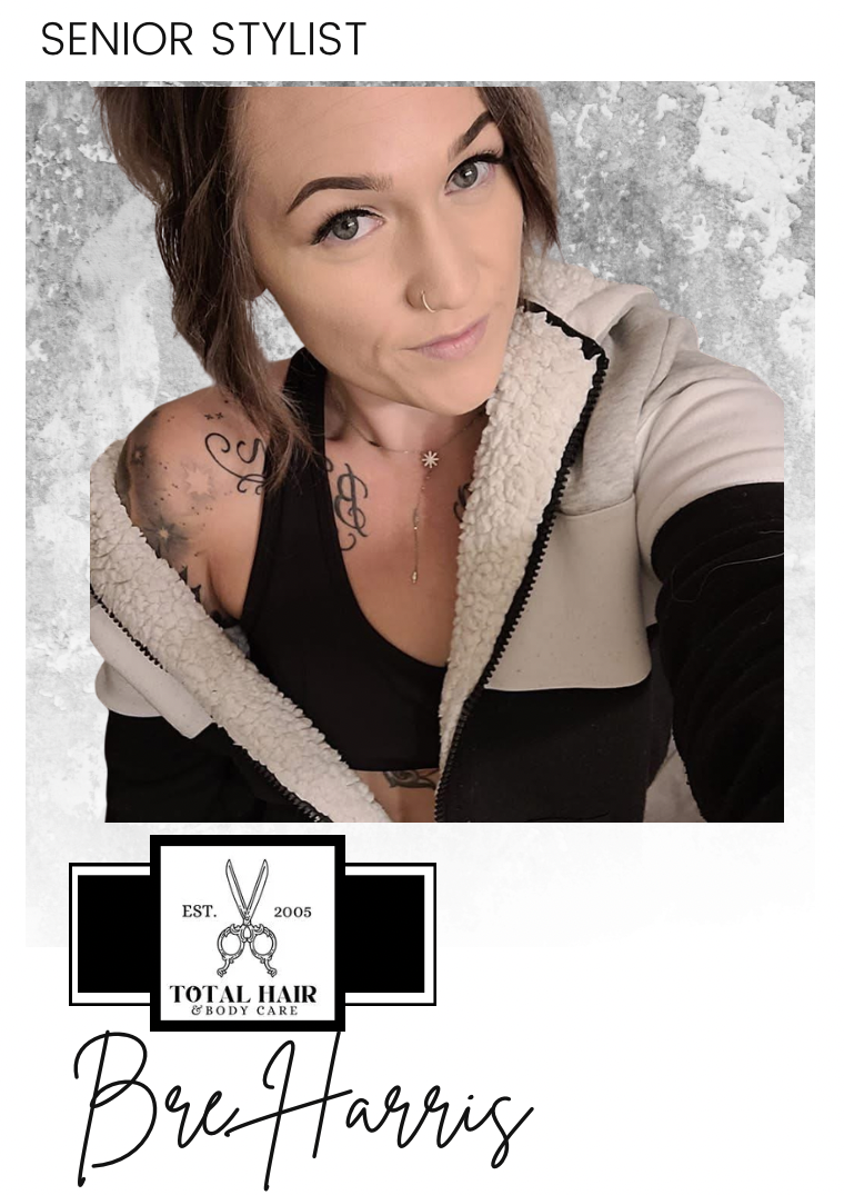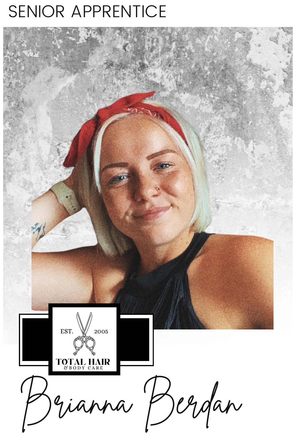 Brianna-Senior ApprenticeBrianna is our Senior Apprentice at Total Hair and Body care. She has 7 years experience in the salon, beginning with Co-op and now as an apprentice. Currently, she is working on obtaining her full licensing. From tailored men’s cuts to fun fashion colours and everything in between Brianna has the skill set to provide anyone with a customs service. |